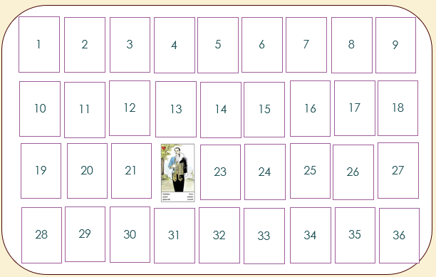 In imaginea de mai jos, cardul celui care a intrebat se afla la numarul 36. Cel care a intrebat poate sa se simta tragic sau sq fie dependent de mediul sau. Aici afirmatia de mai sus este cea mai puternica. Cu toate acestea, afirmatia se aplica si in cazul in care cardul ar fi in locul 9, 18 sau 27, caz in care prezenta sub persoana care a intrebat ar da cel putin indicii pentru comportament. 121..